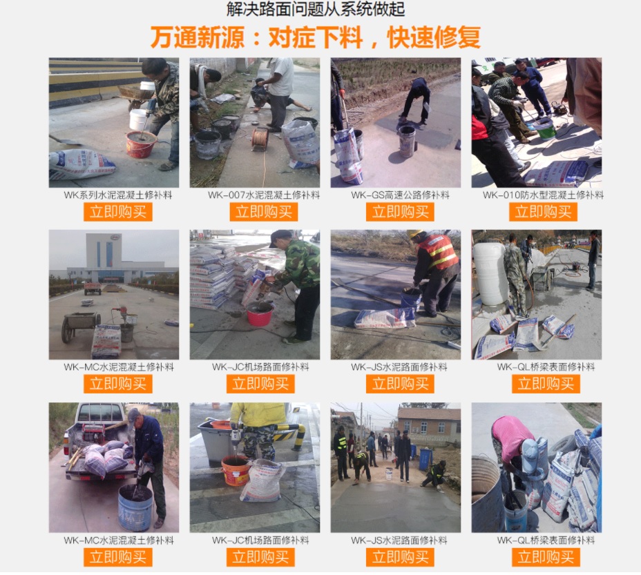 水泥混凝土修補(bǔ)專家----萬通新源中國專業(yè)水泥混凝土修補(bǔ)料材料供應(yīng)商!水泥混凝土修補(bǔ)料專門針對(duì)水泥混凝土路面的麻面、空鼓、起皮、脫殼、裂縫、漏筋等病害進(jìn)行及時(shí)修補(bǔ),直接涂抹在病害部位即可,有好的抗壓和粘接強(qiáng)度,可實(shí)現(xiàn)薄層修補(bǔ),在高速和高壓的行車狀態(tài)下不會(huì)出現(xiàn)破碎和脫落現(xiàn)象;凡是水泥混凝土表面病害均適用于本材料。